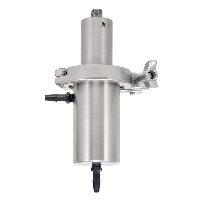 A 1/2″ (13mm) solid tip flow cell probe is included and the volume of liquid inside the chamber with the probe installed is 65mL. A variable speed pump is recommended but not included.