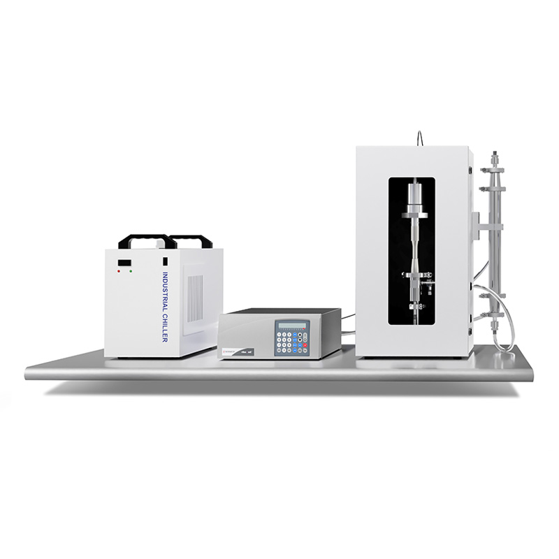 The VCX-2000 Flow Cell Package provides a full setup for flowthrough sonication. VCX-2000FP-220 includes the Ultrasonic Processor, Booster, Flow Cell, Probe, Stand, Sound Enclosure, Chiller & Heat Exchanger.